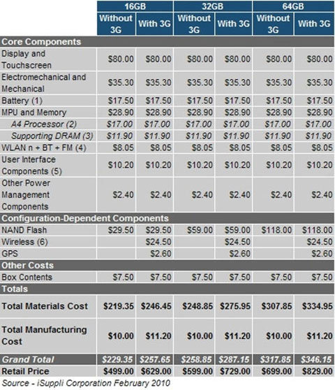 Đây chính là nguồn gốc của giá cả cắt cổ mà các iDevices bắt người mua phải trả. Và tồi tệ hơn nữa là các phiên bản có cấu hình càng cao thì Apple lại "móc túi" người sử dụng càng nhiều. Với phiên bản có cấu hình cao nhất 64GB Wifi + 3G, Apple chỉ mất 346.15$ cho mỗi thiết bị xuất xưởng như lại bán tới 829$ một máy (58.2% lợi nhuận).