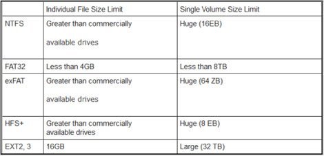 Do vậy, các hệ thống tập tin mới hiện nay như NTFS, exFAT có thể giải quyết vấn đề về dung lượng file, cụ thể như hình sau.