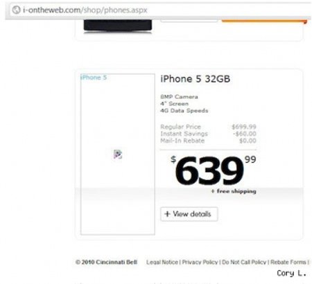 Theo Cincinnati thì iPhone 5 bản 32 GB sẽ có giá 640 USD với máy ảnh 8 MP, hỗ trợ mạng 4G với màn hình 4 inch. iPhone 4S sẽ có màn hình 3.5 inch giống iPhone 4, bộ xử lý A5 và máy ảnh 5MP, sau khi được giảm 300 USD thì giá phải trả là 99$.