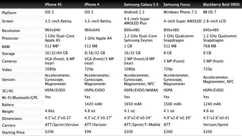 Cấu hình của iPhone 4S tuy mạnh hơn iPhone 4 nhưng lại không tạo được ưu thế rõ nét cho Quả táo trước các đối thủ như Samsung hay Motorola và HTC.