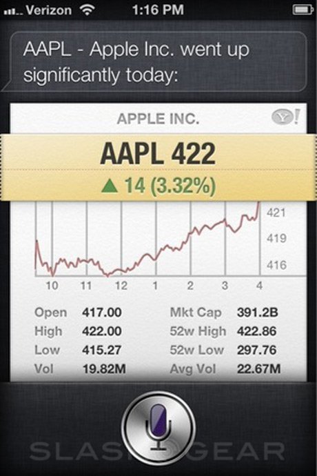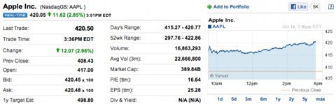 Tính từ 10 giờ sáng đến 3 giờ chiều ngày 14/10 (giờ Mỹ), cổ phiếu của Apple đã tăng 12,07 điểm (tức 2,96%), lên mức 420.5 USD/cổ phiếu. Thông tin đăng trên chuyên trang tài chính của Yahoo!. Chưa dừng lại ở đó, điểm đỉnh của đợt tăng giá cổ phiếu được ghi nhận tại mức 422 USD/cổ phiếu.