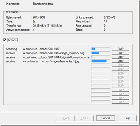 Ngay khi bạn nhấn Finish, HTTrack sẽ bắt đầu quét, lưu trữ và tải toàn bộ nội của dung website để bạn có thể xem offline: