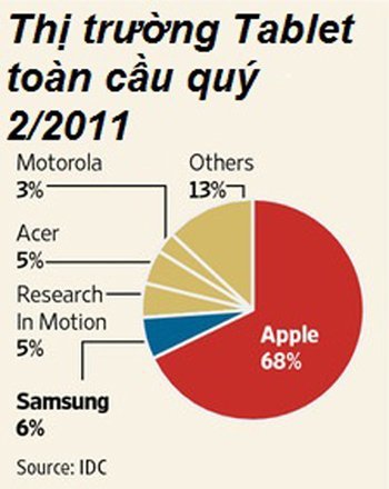 Biểu đồ thị trường máy tính bảng toàn cầu quý 2/2011, trong đó Apple vẫn chiếm thị phần lớn nhất (68%) - Ảnh: Wall Street Journal
