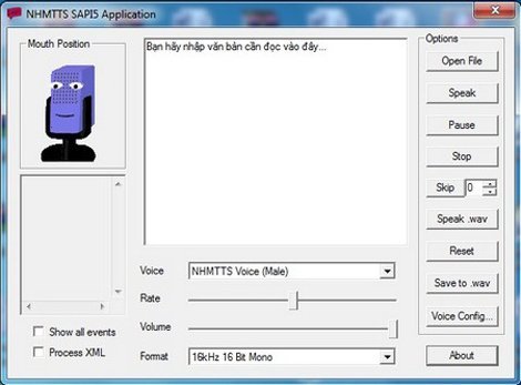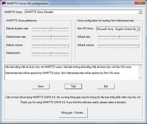 Để thay đổi thiết lập về giọng nói, nhấn nút “Voice Config”, hộp thoại thiết lập như ban đầu sẽ được hiển thị. Tại đây bạn có thể thay đổi các thiết lập của giọng đọc và lưu lại sao cho phù hợp và dễ nghe nhất.