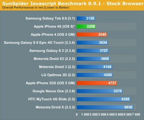 Hãy lấy ví dụ iPhone 4S và Samsung Galaxy S II, đây rõ ràng là 2 đối thủ truyền kiếp và siêu di động xứ Hàn có độ chênh rõ rệt về cấu hình phần cứng. Nhưng, các bài trải nghiệm tốc độ lướt web gần đây đều cho thấy iPhone 4S bứt phá hoàn toàn mọi đối thủ cùng phân khúc trong khi chipset trên dòng máy này xung nhịp thực chỉ đạt... 800MHz lõi kép.