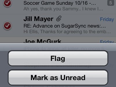 Ứng dụng Mail trên iOS 5 hỗ trợ bạn gắn cờ, sao cho hàng loạt thư cùng lúc để dễ xem lại khi cần thiết. Để gắn sao cho thư, bạn bấm Edit, chọn các thư cần gắn sao rồi bấm biểu tượng Mark phía dưới. Sau đó, bạn chọn Flag để gắn sao cho thư, hay chọn Mark as Unread để đánh dấu là thư chưa đọc.