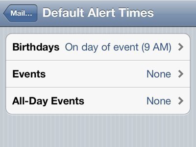 iOS 5 cho phép bạn hẹn giờ phát âm báo cho một sự kiện đặc biệt, chẳng hạn như sinh nhật bạn bè. Nếu không hẹn giờ, âm báo sẽ được phát vào giữa đêm hay 8 giờ sáng rất bất tiện. Khi lên lịch các sự kiện quan trọng như sinh nhật, bạn có thể thiết lập giờ phát âm báo chính xác hơn. Bạn vào Settings > Mail, Contacts, Calendars, chọn Default Alert Times để chọn giờ phát âm báo chính xác cho các sự kiện quan trọng.