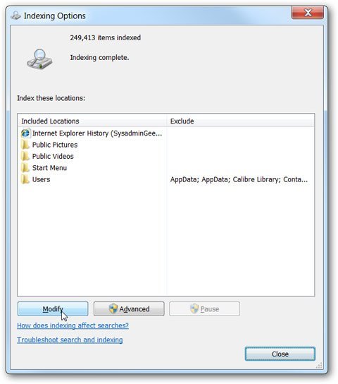 Mở Indexing Options bằng cách vào menu Start > nhập vào “Indexing Options” > Enter. Tại cửa sổ này kích Modify: