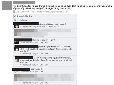 Câu chuyện trên có lẽ chỉ dừng lại ở một vụ tai nạn đáng tiếc, giống như rất nhiều những vụ tai nạn khác vẫn xảy ra hàng ngày. Thế nhưng, hiện giờ, nó lại là tâm điểm chú ý của cộng đồng mạng. Đó là bởi câu status của một Facebooker có tên K.M.C.B đã thản nhiên nhận xét về sự ra đi của ông Giảng, thậm chí còn đùa cợt đến mức nhẫn tâm, gây nên một làn sóng phẫn nộ của cư dân mạng: