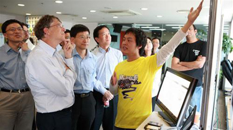 | Việt Anh (giơ tay) trình bày với Bill Gates dự án MyWalk do mình thiết kế - Ảnh: N.D. |