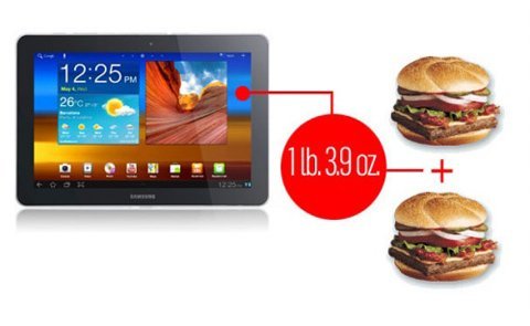 Galaxy Tab của Samsung hiện có khá nhiều lựa chọn về kích thước. Phiên bản 10.1 vẫn nhẹ hơn 1 chút so với iPad 2 của Apple. Với 564,1 gram, nó nặng ngang với 2 chiếc bánh Hamburger.