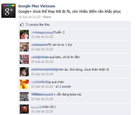 “Google+ cũng vậy thôi, ban đầu tốc độ nhanh chóng mặt. Nhưng dân ta thì đua theo phong trào nhanh lắm. Rồi đâu lại vào đó thôi. Không có lý do gì phải tốn thời gian cho 2 mạng xã hội cùng lúc.” - Thành viên Diehard của diễn đàn Voz nhận xét.