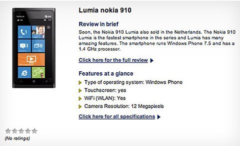 Trang bán lẻ smartphone Typhone.NL của Hà Lan đã tiết lộ những thông tin đầu tiên về chiếc Lumia 910. Ngoài thông tin về camera "hàng khủng", 910 vẫn mang hình dáng của Lumia 900, CPU 1.4 GHz, bộ nhớ 16 GB, hỗ trợ camera trước, kết nối HSDPA (21 Mb/s) và màn hình 4.3".