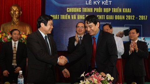 Bộ trưởng Bộ TT&TT Nguyễn Bắc Son và Bí thư Thứ nhất BCH Trung Ương Đoàn Nguyễn Đắc Vịnh ký kết Chương trình phối hợp giai đoạn 2012-2017. Ảnh: Vũ Hương |
