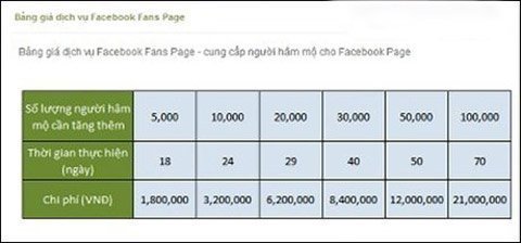 Tại một nhóm mở thảo luận về chủ đề “mua fan, bán like” mang trên Facebook, các bài post về hoạt động mua bán này được thảo luận rất sôi nổi. Tư vấn cho một khách hàng, thành viên Hung… khẳng định: “Xài apps thì trong vòng 1 – 3 ngày, lượng fan tăng cả trăm ngàn là chuyện bình thường”. Theo tìm hiểu, tùy mức độ yêu cầu của khách hàng, giá cả thỏa thuận sẽ khác nhau. Chẳng hạn, một khách hàng muốn fanpage của mình có 700.000 like sẽ phải chạy nhiều ứng dụng song song trong khoảng thời gian 2 tháng, và khoản tiền phải trả vào khoảng trên 80 triệu đồng.