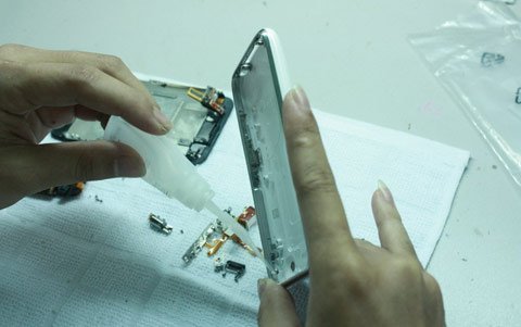 Vỏ màu trắng sẽ được thay bằng vỏ mới, viền kim loại ở giữa sẽ được đánh bóng, còn màn hình bên trái sẽ được tháo ra một lần nữa để thay mặt kính cảm ứng.