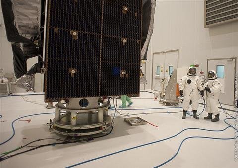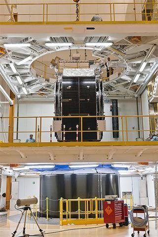 | Sau khi được chuyển ra khỏi thân máy bay, một hệ thống cẩu sẽ đưa container chứa hai quả vệ tinh vào khu lắp ráp hoàn thiện. |