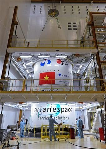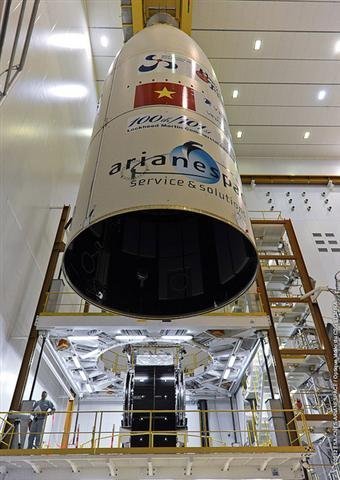 | Lắp ráp VINASAT-2 và hệ thống điểu khiển phóng vệ tinh kép vào phần đầu tên lửa Ariane 5 đã in sẵn quốc kỳ Việt Nam. |