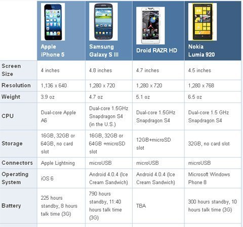 Cụ thể, về màn hình, iPhone 5 tỏ ra lép vế nhất khi kích cỡ màn hình nhỏ nhất và hẹp ngang nhất. Samsung Galaxy SIII và Droid Razr HD gần xấp xỉ nhau về kích cỡ (4,8 inch so với 4,5 inch), trong khi Nokia Lumia 920 đứng ở giữa với màn hình 4,5 inch.