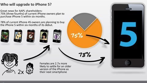 Riêng đối với iPhone 5, một tin tốt lành cho Apple là có tới ¾ người dùng iPhone hiện tại có kế hoạch nâng cấp lên iPhone 5 trong vòng 6 tháng nữa. Trong nhóm người dùng iPhone 4S, nhóm được cho là khả năng nâng cấp iPhone 5 thấp nhất thì tỷ lệ này cũng lên tới 78%.