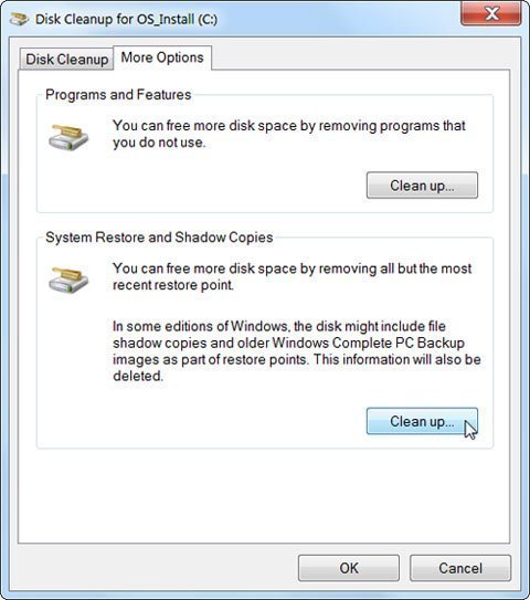 Sau khi thực hiện xong, nhấn chuột vào nút “More Options” và sử dụng nút “Clean up” dưới mục “System Restore and Shadow Copies” để xóa dữ liệu lưu trữ hệ thống. Nút này có tác dụng xóa tất cả các điểm khôi phục (restore point) ngoại trừ điểm khôi phục gần nhất, vì thế hãy chắc chắn máy tính vẫn hoạt động bình thường trước khi sử dụng nút này vì bạn sẽ không thể khôi phục lại hệ thống từ các điểm khôi phục trước đó.