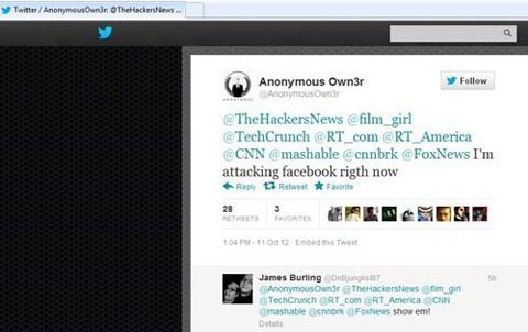 Không lâu khi tình trạng "mất kết nối" được hàng ngàn người dùng Facebook phản hồi, một thành viên với tên gọi AnonymousOwn3r đã viết lên trang mạng xã hội Twitter rằng chính mình và nhóm tin tặc Anonymous là người đứng sau cuộc tấn công nhắm vào Facebook.