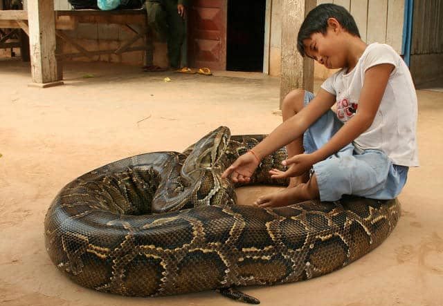 Một gia đình ở làng Sithbou, Campuchia đang nuôi dưỡng một vị khách đặc biệt: một con trăn Miến Điện dài tới 5 mét. Con trăn cái này đã sống cùng gia đình họ suốt 6 năm qua.