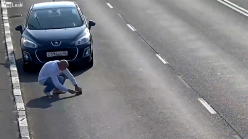 Con hổ bị người đàn ông chộp lưng doạ từ phía sau. Nó giật mình sợ hãi và nằm lăn ra đất.