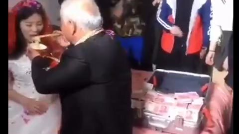 Trong đoạn clip, ban đầu, chú rể tóc bạc phơ đang ngồi trên giường và cố đút mỳ cho cô dâu chỉ đáng tuổi cháu của ông trước sự hò reo cổ vũ của đám thanh niên trẻ. Tuy nhiên, cô dâu vẫn giữ vẻ mặt nghiêm nghị, không có phản ứng hồi đáp. Ngay lập tức, chú rể xoay người đập tay vào chiếc vali đặt ở phía sau.