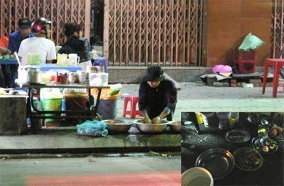 Những xe đẩy hàng rong bán đêm có thể dựng quán ở bất kỳ đâu. Lúc bên cạnh bãi rác, lúc bên cống nước hôi thối, hay ngay vỉa hè đầy bụi bặm. Nhiều quán rong ven đường chỉ cách chỗ khách đi vệ sinh chỉ có vài bước chân.