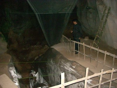 | Toàn bộ phần khai quật ở hang Con Moong đã được bao bọc bằng ni lông và hàng rào tạm. |