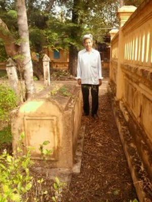 Ông Ngô Văn Minh và ngôi mộ vô danh chứa các hài cốt nhặt được từ nền sân miếu.