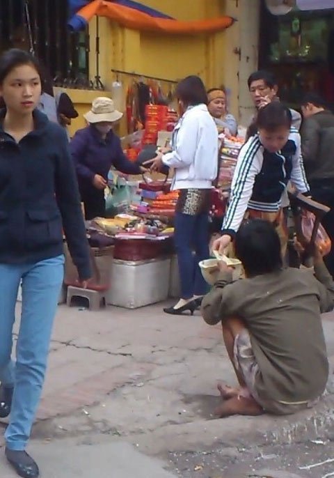 Đi bộ quanh khu vực Văn Miếu để nghe được nhiều hơn những tâm sự của lữ khách qua đây về hình ảnh gã ăn xin, tôi bắt gặp nhiều lắm ánh mắt thăm dò của gã. Gã cảnh giác với cả những người cho mình tiền. Khi đi lướt qua gã, vết loét như vết dao rạch sâu trên chân của gã ăn xin đang loét dần ra để lộ cả phần xương bên trong, lốm đốm những vết trắng của phần da bị bỏng lâu ngày không được chữa trị, đôi môi thâm tím cùng ánh mắt đầy van lơn đã níu chân tôi dừng lại.