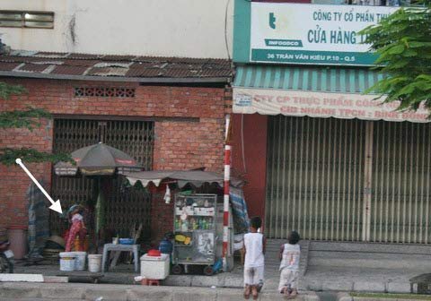Hai đứa bé quỳ trên vỉa hè trong khi người phụ nữ đã bỏ vào trong quán nước. |