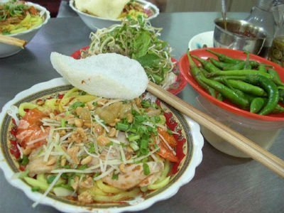 đều với sả xắt mỏng như lá lúa với dầu phụng (dầu lạc), đậu phộng (lạc), thêm
