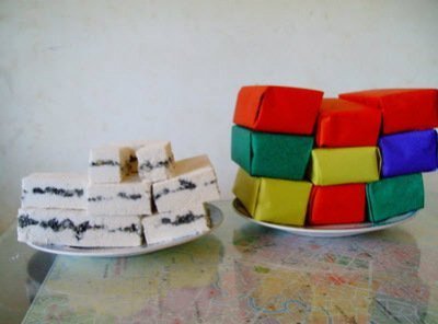 Trên tờ giấy hình vuông, bánh đặt chéo thành 4 hình tam giác gấp vào, dùng hồ dán (bột làm bánh) dính 4 đỉnh tam giác lại. Chiếc bánh được khoác áo vuông đẹp mắt.