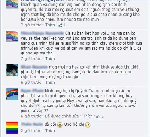 Các thành viên tỏ ra bức xúc và bất bình trước quyết định hủy sau khi đã công nhận xác định giới tính nữ cho cô giáo Trâm. Thành viên Ngan Pham chia sẻ trên fanpage: "Mình ủng hộ chị Quỳnh Trâm, có những câu hỏi phải đặt ra với chính quyền là, tại sao trong 4 năm không hủy quyết định mà bây giờ lại hủy, và tại sao, ban đầu lại đã đồng ý cho đổi? Tại sao lại làm tổn thương niềm vui của người chuyển giới như vầy?".