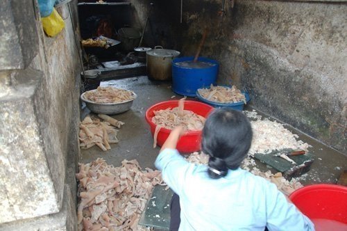 | Dùng chân làm miến tại một làng nghề tại Hà Nội (Ảnh: Tiền Phong) |