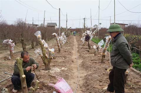 Cây đào cổ thụ từ Tây Bắc, hay núi Mẫu Sơn, Lạng Sơn được đánh về nuôi sống ở bãi mầu Nhật Tân, rồi được cắt cành để ghép gốc cho ra những nụ hoa đẹp nhất.