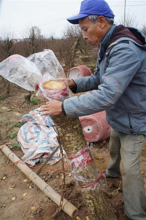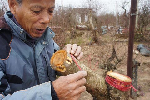 | Người thợ dùng dao khứa quanh thân cây vào thời điểm thích hợp (thường bắt đầu vào tháng 11 hàng năm) để hoa nở đúng dịp Tết. |
