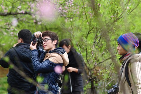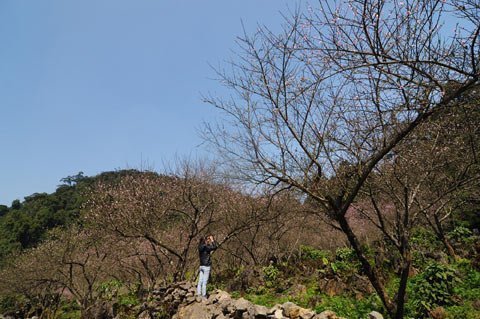 | Các bạn trẻ cố tìm cho mình những góc đẹp nhất để “chộp” lại cảnh sắc của “thiên đường hoa” Mộc Châu. |