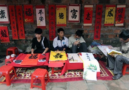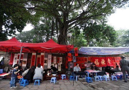| Cũng như mọi năm, những ngày cận tết Quý Ngọ con phố Văn Miếu lại tề tựu hàng trăm "thầy đồ" bán chữ. |