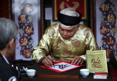 | Trong khi một số ông đồ già vẫn phải chau mày giải nghĩa mỗi khi có khách xin chữ. |