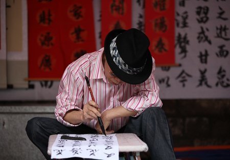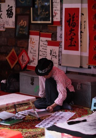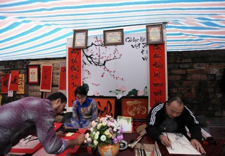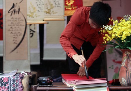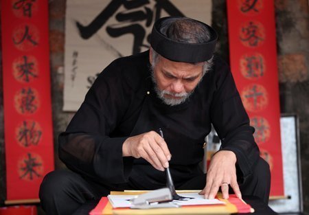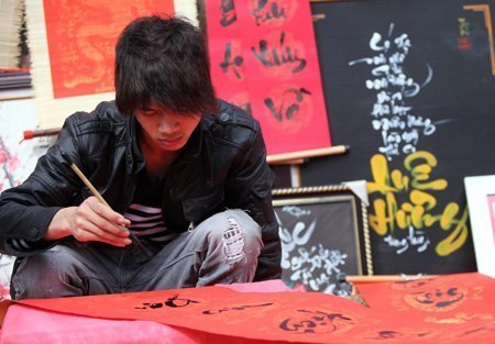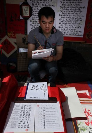 | Một "thầy đồ" trẻ đang múa bút ở phố "ông đồ". |