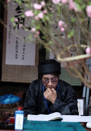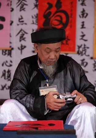 | Một số ông đồ vẫn trung thành với khăn đóng, áo the của thầy đồ xưa. |