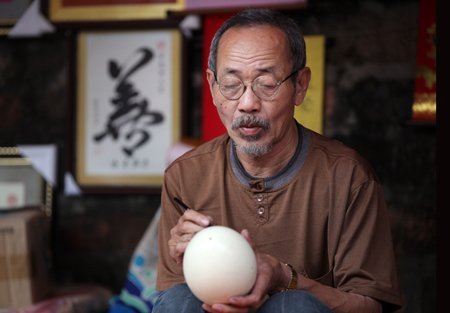 | Không chỉ viết thư pháp trên giấp mà "thầy đồ" này còn sáng kiến viết thư pháp trên vỏ trứng đà điểu. |
