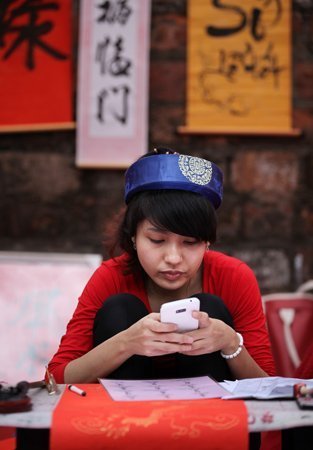 | "Thầy đồ" nữ xinh xắn tranh thủ lướt mạng trên chiếc smartphone trong khi chưa có khách. |