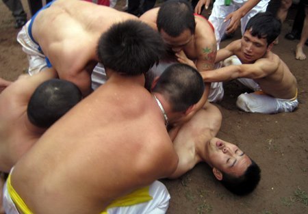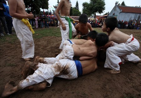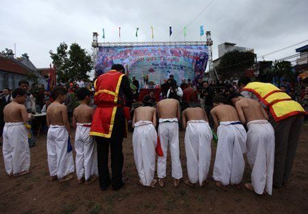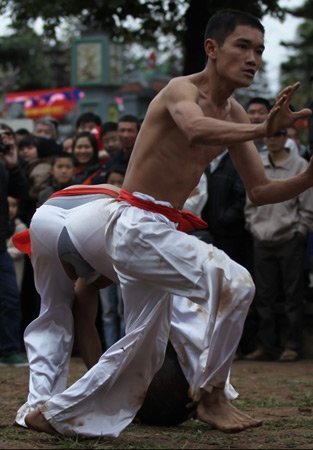 | Trận đấu giữa các tráng đinh phường là trung tâm của hội vật cầu. |