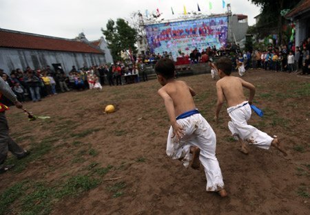 | Sau tiếng còi hiệu lệnh của trọng tài, các chàng trai nhí từ 4 góc sân lao vào tranh bòng đặt ở hố giữa sân. |