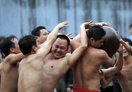 | Quả cầu nặng đến 25 kg được các tráng đinh nhẹ nhàng chuyến nhau. |